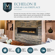 You and your family are going to love the Majestic Echelon II Direct Vent Gas Fireplace - 36". This fireplace comes standard with bronze fire glass burning media that will beautifully reflect the flames of your fire, but there are gas log and gas stone options available if you desire a more traditional look.
